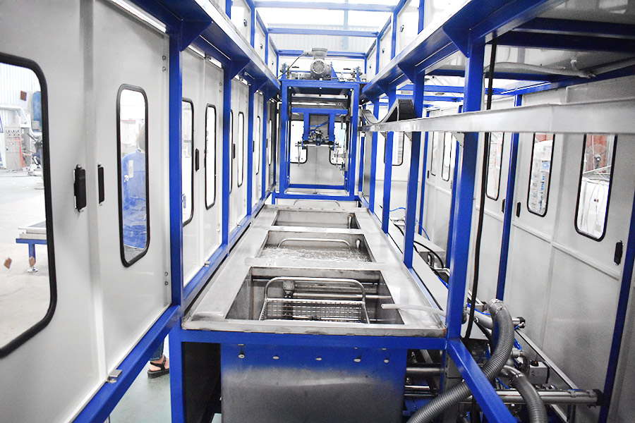 該設備有自動上下料及轉角系統、超聲波清洗系統,自動拋動、自動溢流和油污分離裝置,噴淋系統、自動高壓切水系統、自動烘干系統。機械手自動輸送系統采用高精度直線導軌配合高精度位置檢測傳感器,機械手可以準確的實現工件的抓取和放置。自動進排液和自動加溫系統完全實現了無人干預,自動運行,很大程度上降低了工人的勞動強度。先進的霧氣處理系統可以將清洗時產生的霧氣冷凝回流,空氣經過濾和活性炭吸附后排出。