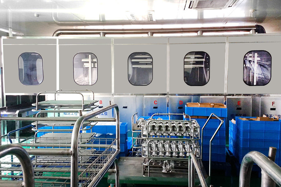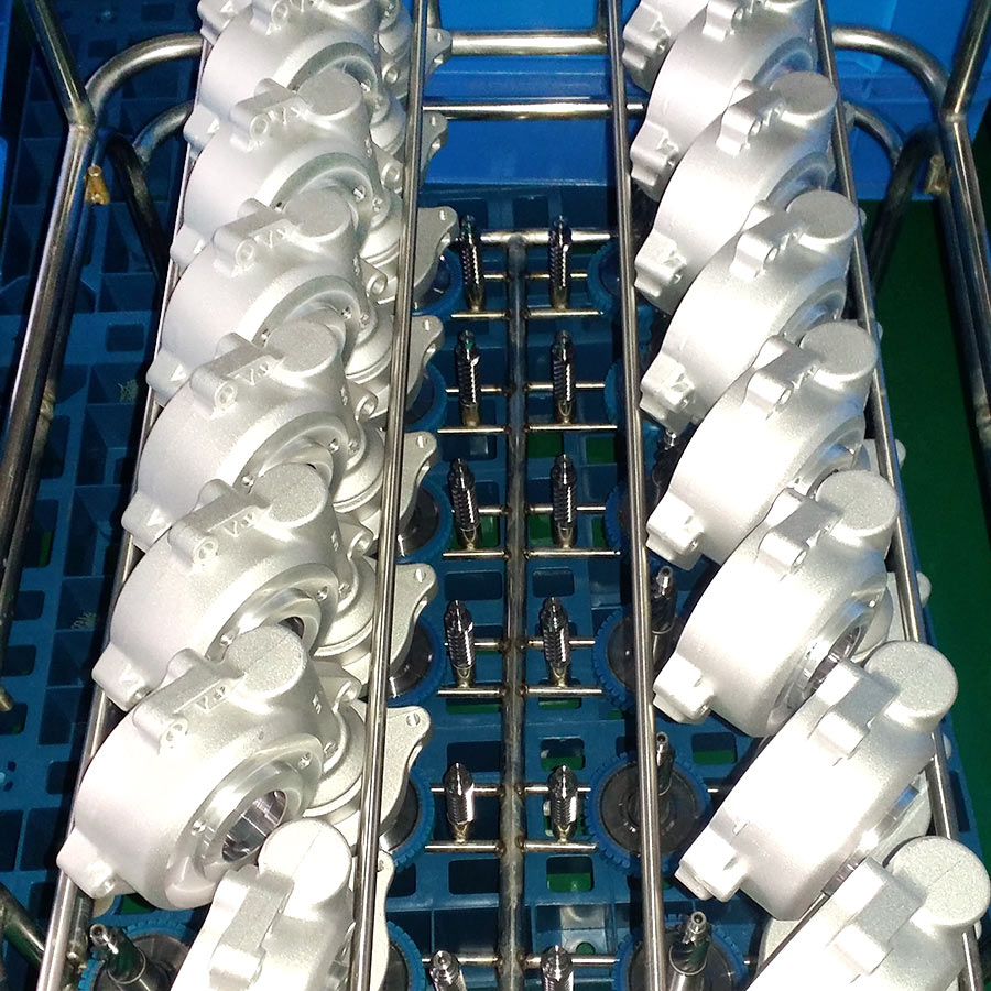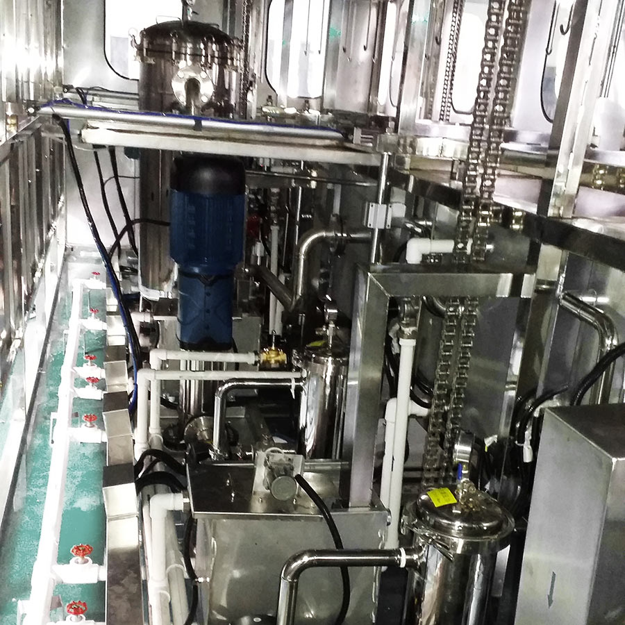 該設(shè)備有自動上下料及轉(zhuǎn)角系統(tǒng)、超聲波清洗系統(tǒng),自動拋動、自動溢流和油污分離裝置,噴淋系統(tǒng)、自動高壓切水系統(tǒng)、自動烘干系統(tǒng)。機械手自動輸送系統(tǒng)采用高精度直線導(dǎo)軌配合高精度位置檢測傳感器,機械手可以準(zhǔn)確的實現(xiàn)工件的抓取和放置。自動進排液和自動加溫系統(tǒng)完全實現(xiàn)了無人干預(yù),自動運行,很大程度上降低了工人的勞動強度。先進的霧氣處理系統(tǒng)可以將清洗時產(chǎn)生的霧氣冷凝回流,空氣經(jīng)過濾和活性炭吸附后排出。