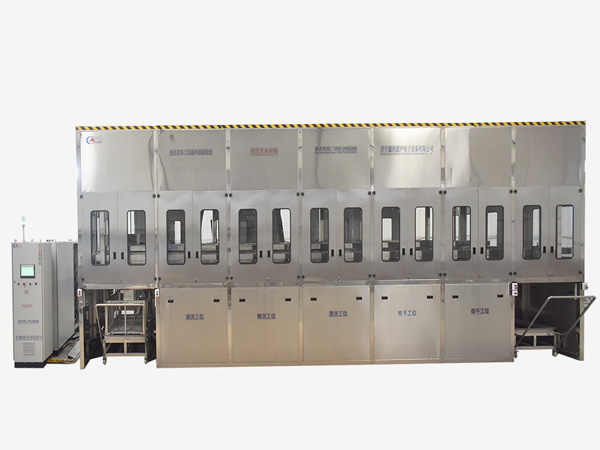 (01)通過設備上面的觸摸屏設置設備運行的各項參數(shù),將裝有工件的料框經(jīng)周轉車人工推入上料工位→(02)設備1號機械手帶動料框將工件運行至超聲波清洗工位,該工位清洗方式為底部+兩側振板式清洗,槽體內部設有拋動裝置,可以對工件進行全方位清洗→(03)超聲波清洗完畢后1號機械手將工件運行到超聲波漂洗工位。超聲波漂洗采用的是投入式超聲波振板結構,振板安裝在槽體的底部+兩個側面,槽體內部設有拋動裝置,對工件進行全方位漂洗→(04)超聲波漂洗完畢后1號機械手將工件運行到鼓泡漂洗工位,風機通過漂洗槽底部設置的出氣口均勻的將空氣吹入到液體中形成均勻微小的氣泡,利用氣泡的破裂將工件表面的附著物和清洗液去掉,槽體內部設有拋動裝置,可以徹底去除工件上的殘留液,提高工件表面的潔凈度。1號機械手放入工件后上升返回至上料工位將待定在上料工位的料框抓取放入超聲波清洗槽。→(05)鼓泡漂洗完畢后,2號機械手將鼓泡槽內漂洗后的料框抓取運行至風切工位。風刀采用不銹鋼精密風刀。風刀出風口間隙和出水角度可調;該工位可以將工件上面的水分切掉縮短干燥時間。→(06)高壓風切完畢后,2號機械手將風切槽內 料框抓取運行至熱風干燥工位。高壓熱風烘干采用熱風發(fā)生器,熱風通過槽體兩側及底部進入,通過回風口將槽體內的風抽回,經(jīng)過加熱后重新吹入到槽體內。可以對工件進行快速干燥。彼時1號機械手將超聲清洗槽內清洗結束的工件運行至超聲漂洗槽內→(07)工件經(jīng)干燥后由2號機械手臂將裝有工件的料框運行至下料工位的周轉車上。依次1、2號機械手進行往復搬運工作有效提高了清洗效率。