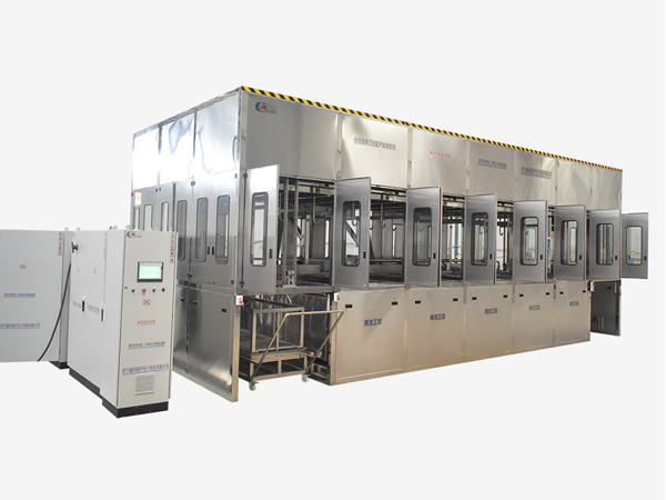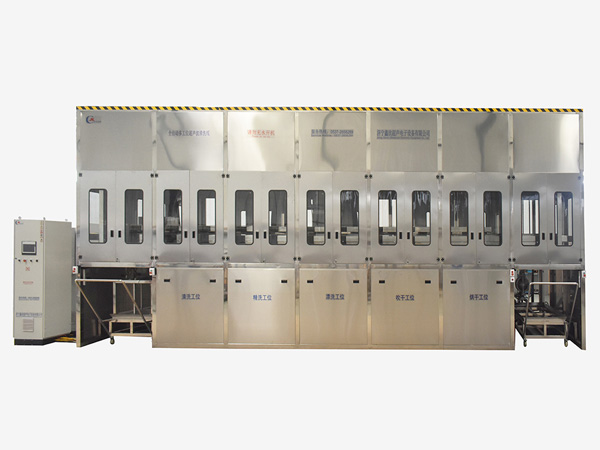 該設備為全自動高潔凈度清洗烘干機,采用超聲波清洗工藝。整機采用2套龍門桁架式傳動機構,PLC+觸摸屏控制。該設備共七個工位:上料工位、超聲波清洗工位、超聲波漂洗工位、鼓泡漂洗工位、高壓風切工位、熱風干燥工位、下料工位。該設備還包含霧氣處理裝置、循環(huán)過濾、拋動裝置、管路系統(tǒng)及智能電器控制系統(tǒng)等組成。該設備清洗效果好、提高了工件的清潔度。該機結構設計及工藝安排合理、自動化程度高、清洗精度高,有效解決了此類工件的清洗難題。