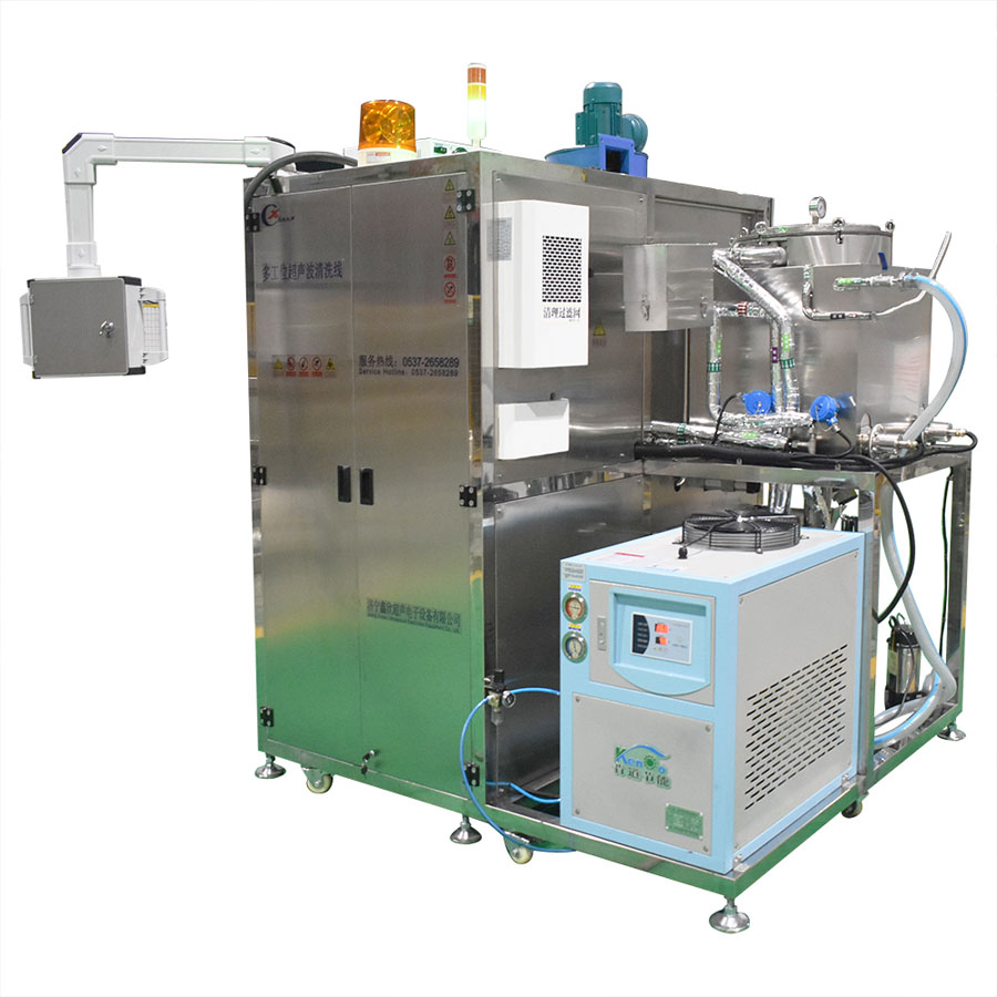 該設備為高潔凈度清洗機,采用碳氫超聲波清洗工藝。該設備由超聲波清洗槽、蒸汽浴洗槽、清洗網(wǎng)框、清洗槽冷凝區(qū)、分水器、工業(yè)冷水機、溶劑回收機、管路系統(tǒng)、智能控制系統(tǒng)等組成
