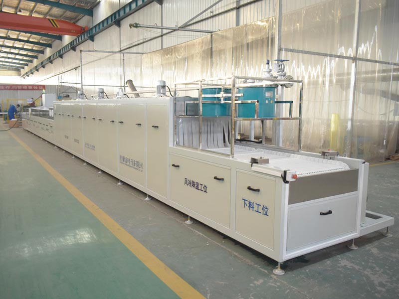 該設備為全自動高潔凈度清洗機,整機為網帶鏈條式傳動機構。采用超聲波清洗、人工高壓補洗、高壓噴淋清洗、慢拉脫水工位、高壓風切、人工補吹、干燥爐、風冷等工藝。該設備共5個工位:上料工位、超聲波清洗工位、人工高壓補洗工位、高壓噴淋清洗工位、慢拉脫水工位、高壓風切工位、人工補吹工位、干燥爐、風冷工位、下料工位。該設備清洗效果好、提高了工件的清潔度。該機結構設計及工藝安排合理、自動化程度高、清洗精度高,有效解決了此類工件的清洗難題。